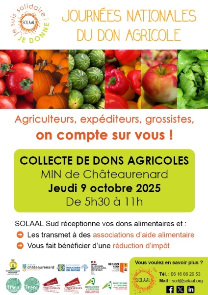 SOLAAL Sud, l’association de solidarité créée par des agriculteurs, et le MIN de Châteaurenard organisent une collecte de dons alimentaires le jeudi 9 octobre 2025.
